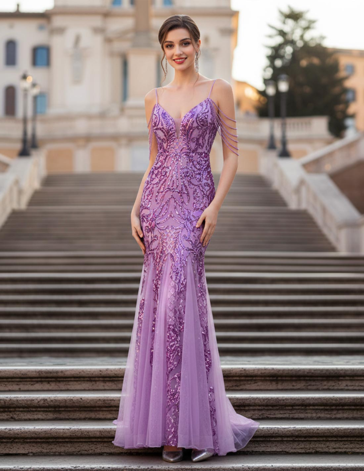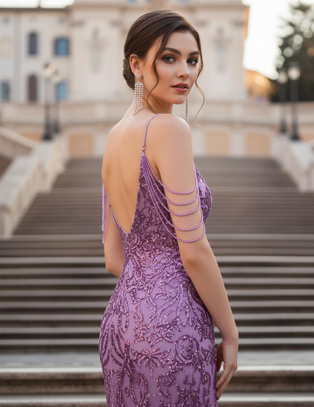 Abito da Sera Lungo Lilla a Sirena con Ricami Scintillanti paillettato