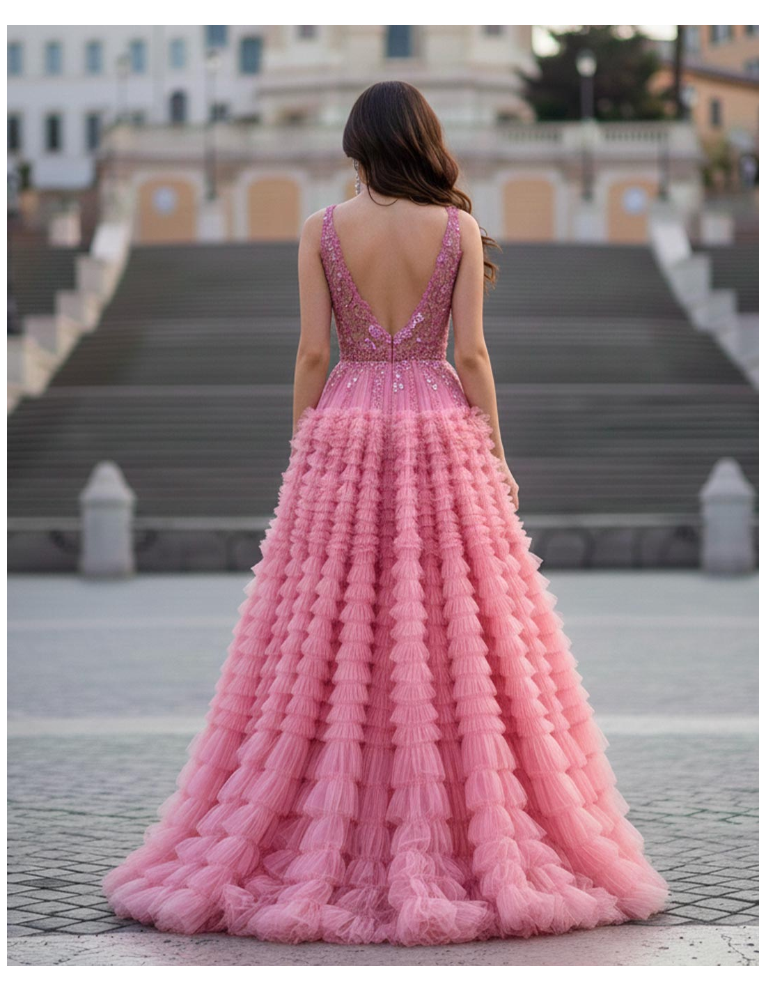 Abito da Cerimonia principesco con gonna a balze in tulle e corpetto in pizzo rosa confetto