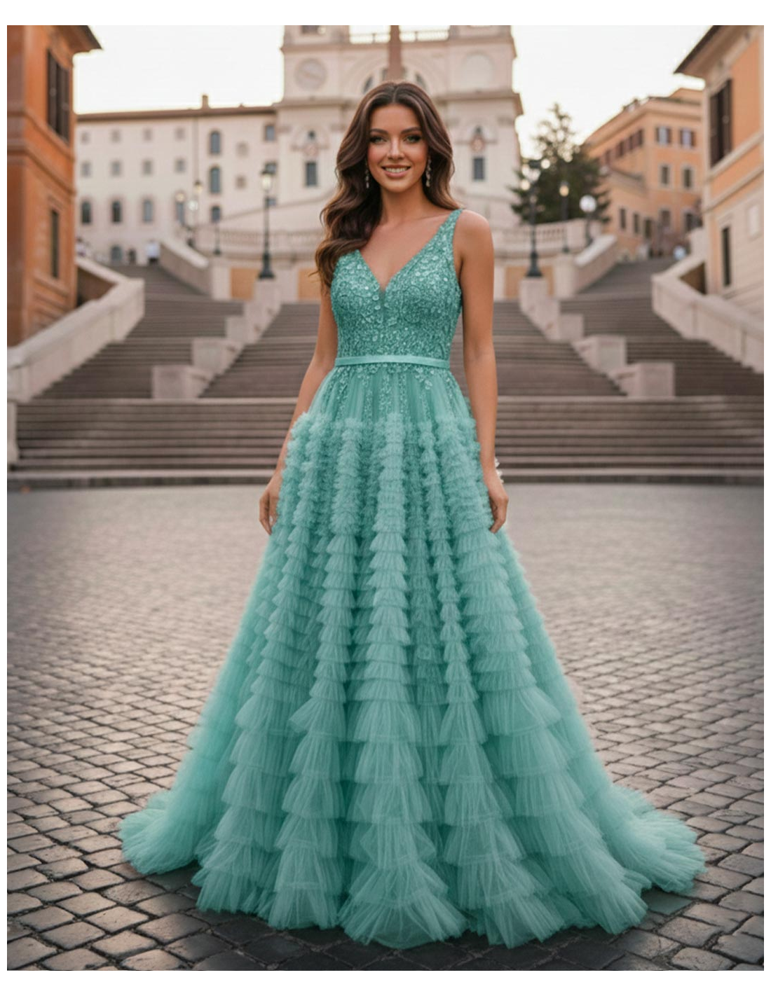 Abito da Cerimonia principesco con gonna a balze in tulle e corpetto in pizzo verde