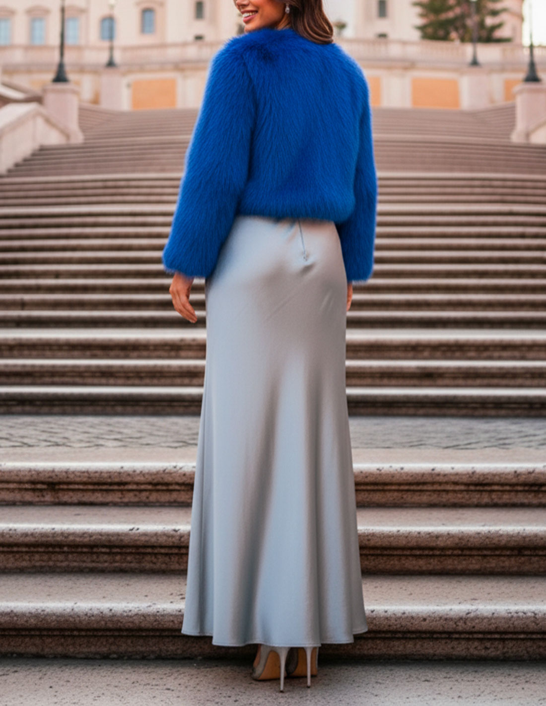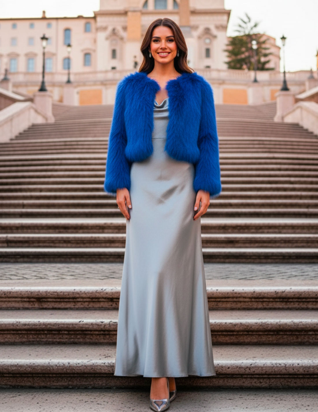 Pelliccia Ecologica Blu elettrico Accollata Corta da cerimonia
